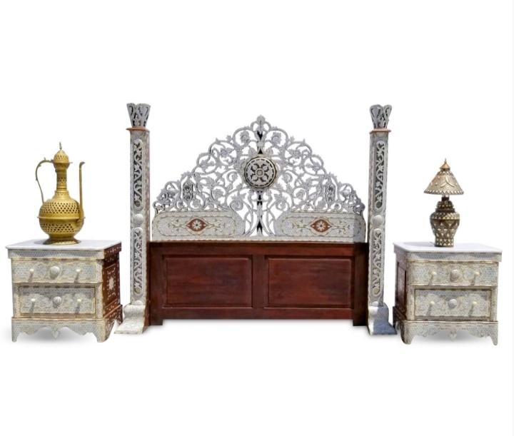 Exquiste syrian mother of pearl king size bed set, get the royal luxury feel with this amazing bedroom furniture piece.